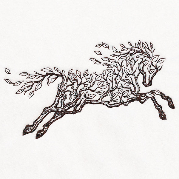Winding roots and leaves form a curious woodland creature. Let this stallion soar on pillows, jackets, totes, and more.