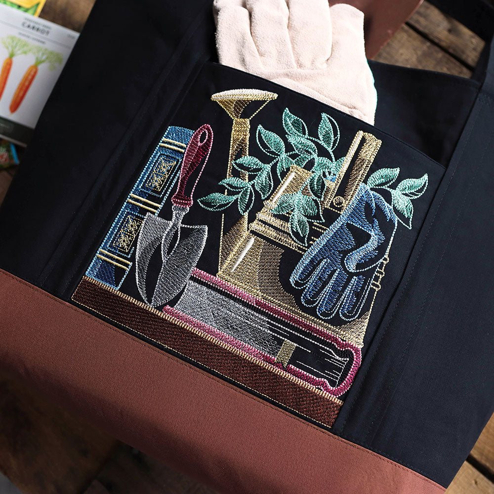 Celebrate your love of gardening with this collectible bookshelf scene machine embroidery design, featuring a charming arrangement of well-loved gardening books, hand tools, gloves, a watering can, and leafy potted plants tucked between the shelves. Intricate details and layered textures create depth and personality, making this design a perfect accent for projects inspired by potting sheds, greenhouse days, and plant-filled spaces. This machine embroidery design contains sheer stitching and open areas. For best results, stitch on solid dark-colored fabric.