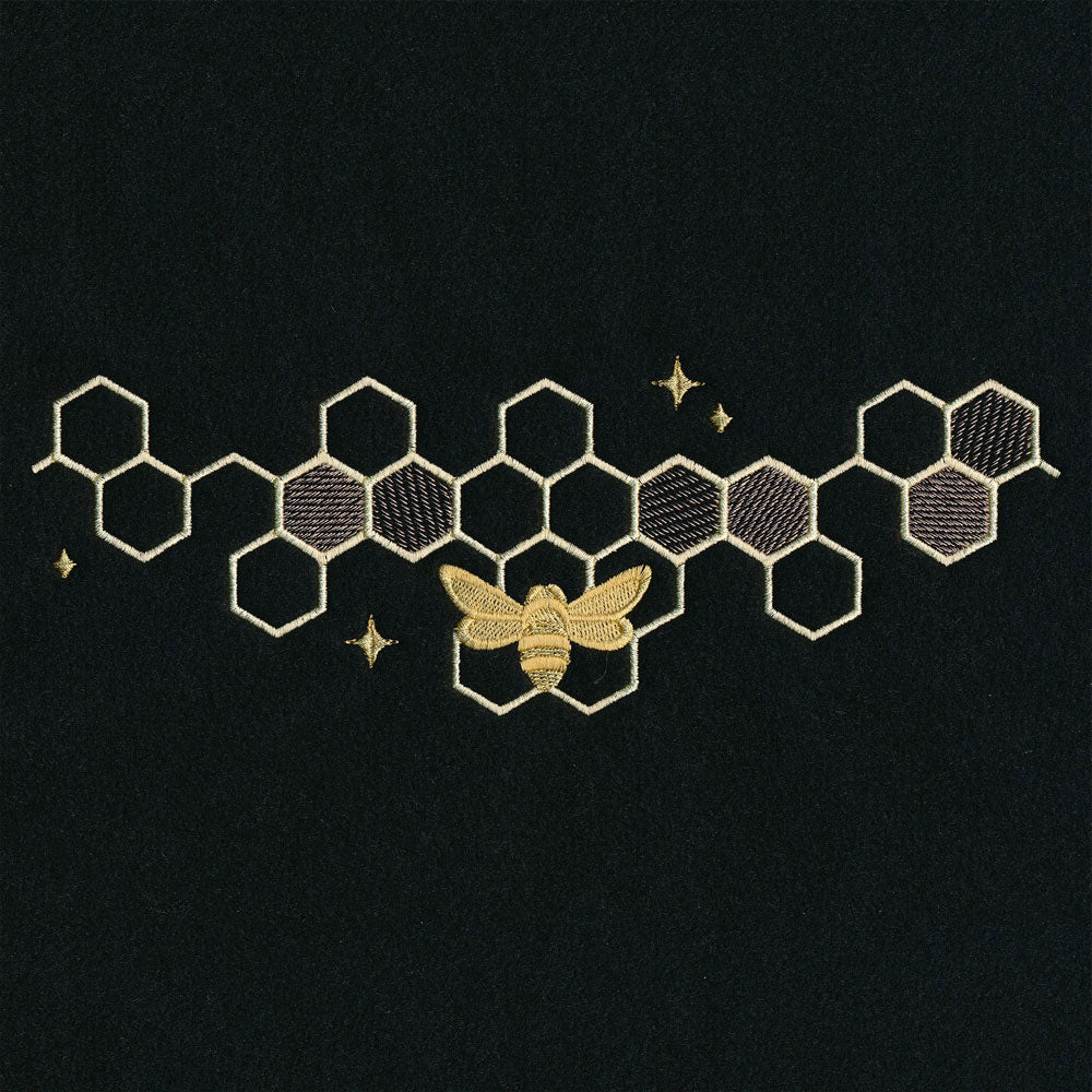 Make a bold statement with this queen bee back embroidery design. Featuring bees and honeycomb in a striking layout made for apparel, this design is perfect for the backs of jackets, hoodies, shirts, and more, and pairs beautifully with the rest of the Queen Bee Apparel Design Pack.